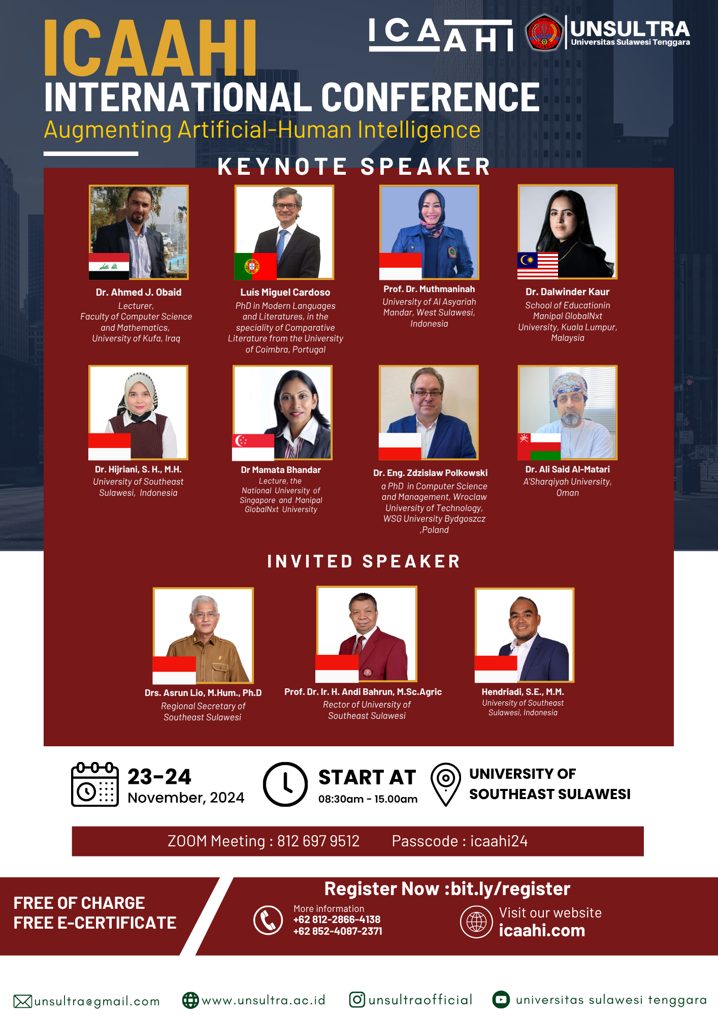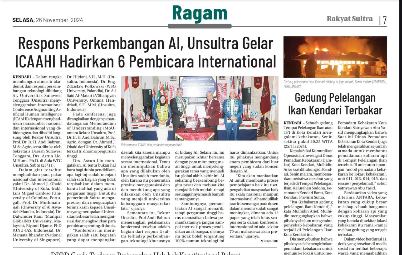 ICAAHI 2024 was successfully held on November 23–24, 2024, at the University of Southeast Sulawesi (UNSULTRA). With the theme “Augmenting Artificial–Human Intelligence”, the conference brought together a diverse range of international scholars, experts, and practitioners to discuss recent advancements and interdisciplinary approaches in applied AI and human interaction.